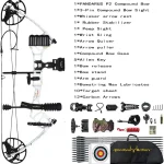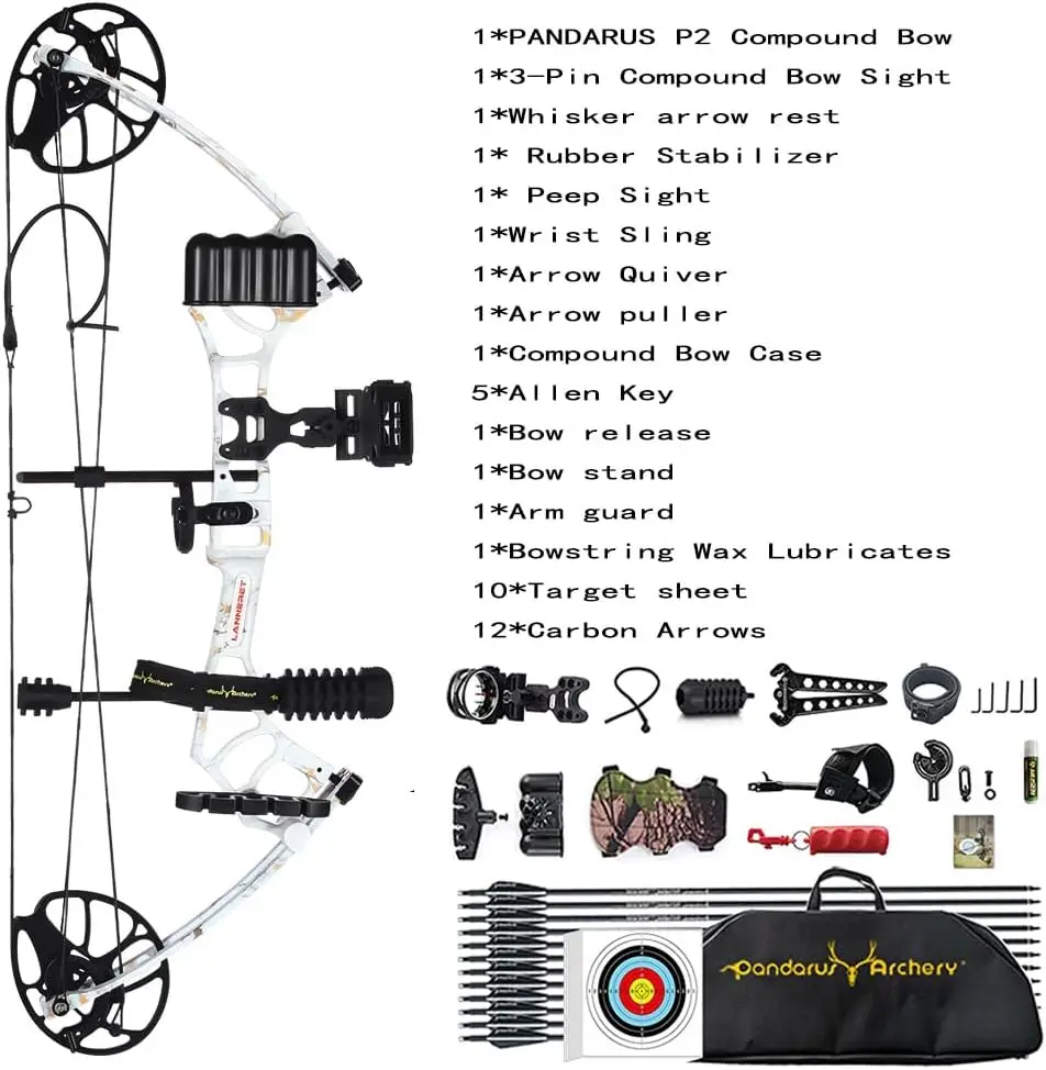 5. Pro Package:1 *P2 Compound Bow,1*3-Pin Compound Bow Sight,1*Whisker arrow rest,1* Rubber Stabilizer,1* Peep Sight,1 *Wrist Sling,1*Arrow Quiver,1*Arrow puller,1*Compound Bow Case,1*Allen Key,1*Bow release,1*Bow stand,1*Arm guard,1* Bowstring Wax Lubricates,10*Target sheet,12*Carbon Arrows