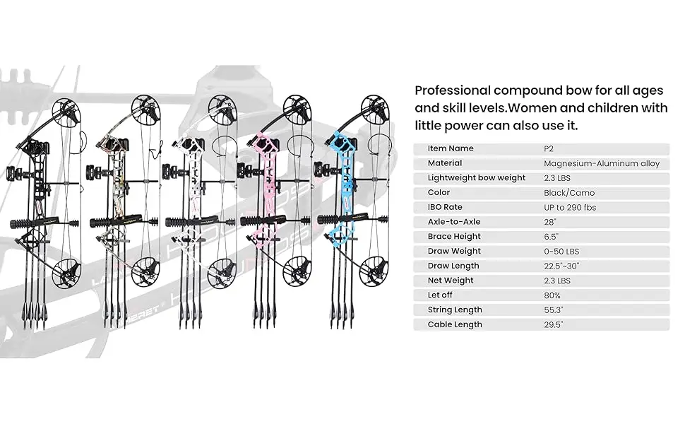 1. Specifications:Large range of adjustable draw length 22.5″~30″,draw weight 0 -50 lbs without needing a bow press. IBO Rate:UP to 290 fbs,Let off:80%,Axle-to-Axle:28″,Brace Height:6.5″,String Length:55.3″,Cable Length: 29.5″,Lightweight Bow weight:2.3lb